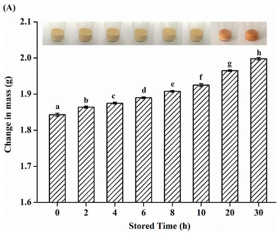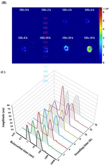 The SHs flour was stored for 30 h in a high RH (75%) and the water migration in SHs flour was studied. As shown in (Figure 2A), the SHs flour was photographed during the process of moisture adsorption under the conditions of 75% RH and 25 °C. When the SHs flour did not performed moisture absorption at the standing time 0 h, the surface of SHs flour was the amorphous and loose state. When the storage time reached 10 h, the loose state was slightly damaged and the color was slightly deeper. The deliquescence induced the changes on the surface of SHs flour at 10 h. When the storage time was 20 h, the surface shape of SHs flour generated obvious changes. Compared with SHs-0 h, the color of SHs flour stored for 20 h (SHs-20 h) was greatly deeper, the volume was obviously smaller, and the surface became sticky. When the storage time increased to 30 h, the color of SHs flour stored for 30 h (SHs-30 h) was the deepest; the volume of sample was the smallest because of the action of water tension [10], and the surface of sample was obviously liquefied. The amorphous and loose state of SHs flour changed into a partially crystalline state, and the volume of SHs flour dramatically shrunk. If time is long enough, the peptide flour may be completely liquefied. Moreover, the mass of sample significantly increased throughout the experiment (p < 0.05), which indicated that the SHs flour absorbed plenty of water. Then, the nuclear magnetic imaging (MRI) technology was used to explain the signal of hydrogen protons in order to further understand the changes of water in SHs flour [23].