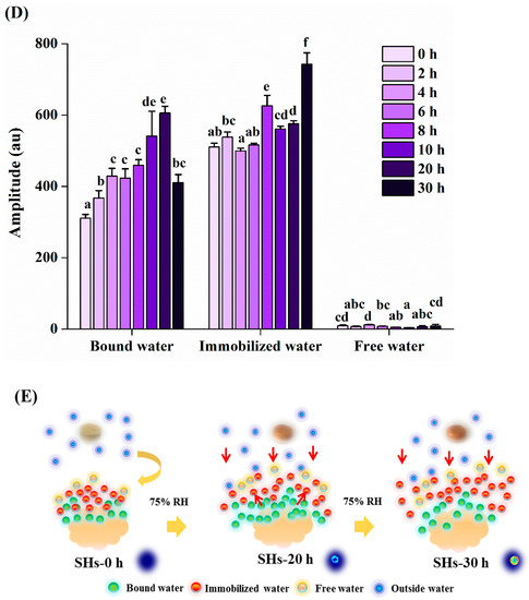where M(t) is the residual magnetization at a given time t after application of the first RF pulse, n is the quantity of the exponential functions in the specimen, A2i and T2i is the signal intensity of relaxation amplitude and time of the ith component, and d(t) is the residual error. The unstored hydrolysate flour was named SHs-0 h and stored SHs for 30 h at 25 °C and 75% RH was named SHs-30. SHs-0 h and SHs-30 h were selected for subsequent.