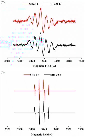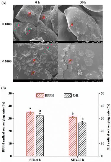 (A) Surface structure changes observed by SEM (1000× and 5000×). (B) The DPPH and OH radical scavenging rate of SHs-0 h and SHs-30 h. (C) The EPR spectra of DPPH radical scavenging ability. (D) The EPR spectra of OH radical scavenging ability.