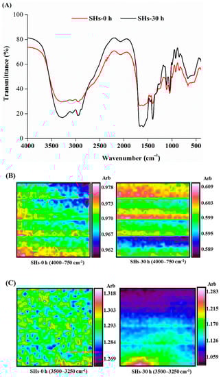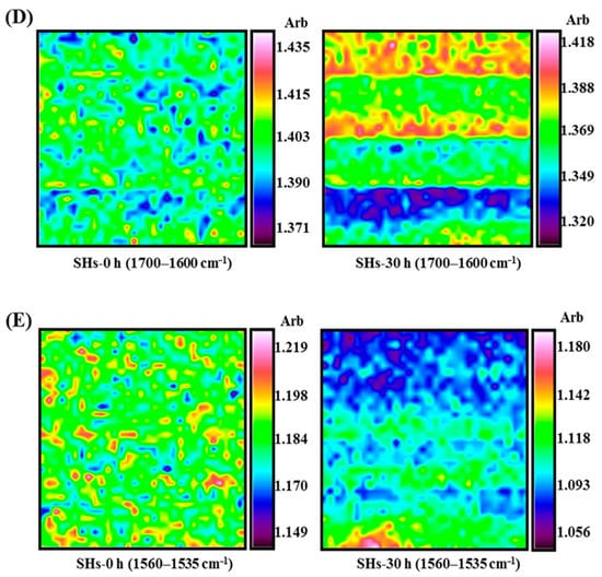 (A) Mid-infrared spectra of SHs-0 h and SHs-30 h. (B–E) Infrared microimaging spectra at 4000–750 cm−1, 3500–3250 cm−1, 1700–1600 cm−1 and 1560–1535 cm−1 of SHs-0 h and SHs-30 h.
