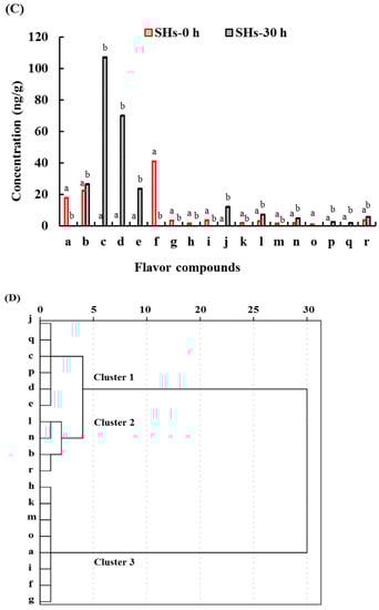 Volatile compounds in SHs-0 h and SHs-30 h flour were identified according to the matched retention index (RI). Most volatile compounds were found in databases, which could represent the authority of the identification. Cyclohexanone served as an internal standard and the peak areas were standardized. The characteristic chromatograms of the SHs-0 h and SHs-30 h are shown in (Figure 5A,B), respectively. As shows in (Table 1), a total of 18 volatile compounds with Chemical Abstracts Service (CAS) registry numbers were identified in the SHs-0 h and SHs-30 h. The volatile compounds were classified according to their structure, including 7 alcohols, 4 aldehydes, 4 arenes, 2 acids, and 1 ester. The SHs-0 h and SHs-30 h contained 12 and 10 major volatile components, respectively. There were four kinds of volatile compounds in SHs-0 h and SHs-30 h including (b) 4-penten-2-ol, (l) benzaldehyde, (n) nonanal, and (r) oleic acid. After SHs flour was stored for 30 h, eight volatile compounds disappeared, which included (a) 2-methoxy-ethanol, (f) 2-pentanol, (g) paraldehyde, (h) butanoic acid, (i) hexanal, (k) o-xylene, (m) 2-ethyl-1-hexanol, and (o) naphthalene. The SHs-30 h was detected 6 new volatile compounds including (c) 2-nitro-ethanol, (d) 1-methoxy-2-propanol, (e) 3-methyl-2-butanol, 2, (b) 4-dimethyl-heptane, (p) tetradecane and (q) 2-hexyl-1-decanol. Cluster analysis of SHs flour’s volatile compounds was conducted according to the standardized peak areas of volatiles. The classification of each flavor component in the SHs-0 h and SHs-30 h flour can be clearly observed. As shown in (Figure 5D) and (Table 1), the cluster 1, including (c) 2-nitro-ethanol, (d) 1-methoxy-2-propanol, (e) 3-methyl-2-butanol, 2, (b) 4-dimethyl-heptane, (p) tetradecane and (q) 2-hexyl-1-decanol, represented the volatile compounds generated during the storage. The cluster 2, including (b) 4-penten-2-ol, (l) benzaldehyde, (n) nonanal, and (r) oleic acid, represented the volatile compounds the concentrations of which increased during the storage. The concentrations of these volatile compounds had significant changes during the storage (Figure 5C). The cluster 3 included the chemicals of (a) 2-methoxy-ethanol, (f) 2-pentano, (g) paraldehyde, (h) butanoic acid, (i) hexanal, (k) o-xylene, (m) 2-ethyl-1-hexanol, and (o) naphthalene, which disappeared during the storage.