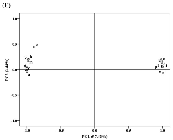 As shown in (Figure 5C), the concentration of 18 volatile compounds which had significant changes during the moisture adsorption. It was observed that 4 volatile compounds increased after moisture absorption. The concentrations of (b) 4-penten-2-ol, (l) benzaldehyde, (n) nonanal, and (r) oleic acid increased to 26.22 ± 0.30, 7.10 ± 0.20, 4.70 ± 0.20, and 5.61 ± 0.20 from 22.21 ± 0.20, 2.75 ± 0.30, 1.47 ± 0.30, and 3.32 ± 0.30 ng/g, respectively. Meanwhile, the changes of (c) 2-nitro-ethanol, (d) 1-methoxy-2-propanol, (e) 3-methyl-2-butanol, and (f) 2-pentanol were sizable. The principal component analysis (PCA) results revealed that the differences of the volatile compounds are shown in (Figure 5E). The PC1 and PC2 accounted for 97.43% and 2.44% of the total peak areas’ variances, respectively. Among all the volatile compounds, the PC1 was accounted for its positive part by 10 volatile compounds. The concentration of the right volatile compounds increased or generated during the storage. About its negative part, the PC1 was explained by other compounds. The concentration of the left volatile compounds decreased during the storage. Meanwhile, the PC2 explained its positive part by 17 of total compounds and on its negative part by 1 volatile compound. These revealed that the samples generated some reactions in high environmental humidity. It was reported that the nonanal possessed a lipid flavor [48]. Meanwhile, the changes of alcohols were large after moisture absorption. Some alcohols derived from the oxidation of materials [17,48]. The action of oxidation or microorganisms might induce peptides, amino acids, and other compounds to degrade [10]. Meanwhile, the water combined with peptides might influence the release of volatile compounds. Therefore, the moisture absorption affected the volatile compounds of peptides. The moisture and temperature are also significant factors about flavor formation during the storage [49]. This study monitored the changes of volatile compounds at 75% RH and 25 °C. The peptides generated some volatile components and certain volatile components disappeared in this process. In brief, the moisture absorption affected the quality of SHs flour. The effects of the temperature and moisture on volatile components of SHs flour in the storage are still unclear. The mechanism of their formation will require further study.