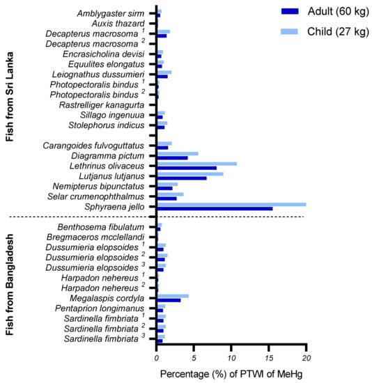 Potential consumer exposure for adults and children to methylmercury (MeHg), expressed as the metal content in one portion (43 and 26 g for Sri Lankan adults and children, respectively, and 54 and 32 g for Bangladeshi adults and children, respectively) of the various fish species from Sri Lanka and Bangladesh compared to the provisional weekly intake (PTWI) set by the JECFA. 1,2,3 Fish species sampled multiple times at separate locations.
