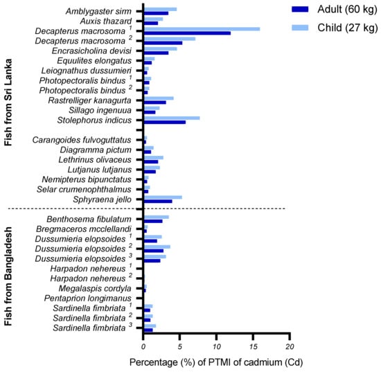 A preliminary estimation of the potential risk to human health related to cadmium and mercury exposure through fish consumption was established by evaluating the estimated daily intake of fish compared to the PTWI. This was determined on the basis of the average contents of metals in fish tissue and the average daily fish consumption rates. The values were presented as the percentage of the PTWI and PTMI values for MeHg and cadmium, respectively, as provided by the JECFA. For the exposure assessment of mercury, a precautionary approach was applied assuming that the total mercury in fish was entirely in the form of MeHg [,,,,]. For cadmium, the values were calculated assuming a fish intake of four times per month (one time per week) for each fish species. The calculations were not performed for arsenic and lead as no PTWI values are available for these metals. The consumer exposure estimation was performed for both an average South Asian adult of 60 kg and a 10 year old child of 27 kg [,,]. A daily Sri Lankan serving size of fish was estimated to be 43 g, according to the Household Income and Expenditure Survey (HIES) report from 2016 [,]. For Bangladesh, fish consumption was assumed to be higher at 54 g/day according to the HIES from 1991, 2000, and 2010 []. Due to the unavailability of intake rates for different age groups, an intake of 60% of that of an adult was assumed for children.
