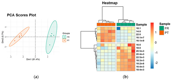 Multivariate principal component analysis (PCA) of the FA dataset showed that the experimental groups (FR and PT) were well discriminated in a two-dimensional score plot with the first two dimensions (dim), expressing 97.1% of the total variance (91.4% of dim1 and 5.7% of dim2). The two groups were separated along dim1 with FR samples located at positive values and PT samples at negative values (Figure 1a). The most relevant variables explaining the variability of dim1 (contributions > 10%) were PUFA 18:2n-6 (41.7%), 16:4n-3 (15.5%), 18:4n-3 (15.1%), and 22:5n-3 (11.5%) (Supplementary Figure S2), which were increased in the FR group.