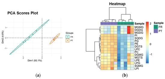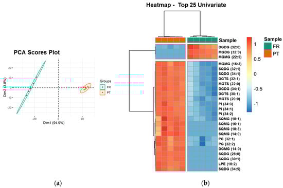 PCA analysis of the lipid species dataset showed that the two groups, the FR and PT samples, were discriminated in a two-dimensional scores plot, expressing 98.7% of the total variance in the dataset (94.9% of dim1 and 3.8% of dim2) (Figure 3a). The most relevant contributors to dim 1 (contributions > 4%) included exclusive species of each group: the galactolipid species MGDG (32:0) and MGMG (22:5), increased in FR samples, and the sulfolipid species SQDG (28:0), SQDG (30:1), and SQMG (16:1), increased in PT samples (Supplementary Figure S9).