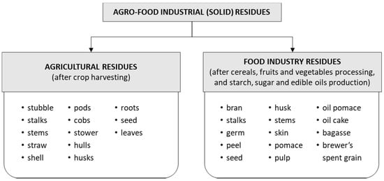 The increasing expansion of agro-industrial activities in recent decades has resulted in the accumulation of a large amount of lignocellulosic residues (wastes or by-products) worldwide, which are not properly disposed of and thus contribute to climate change, as well as soil, water, and air pollution [16,17]. An estimated one-third (≈1.3 billion tonnes) of food produced for human consumption is wasted annually worldwide [18]. Although some of these residues are used as animal feed, large quantities are disposed of in landfills or incinerated [17]. In general, AFIRs can be divided into agricultural residues and food industry residues (Figure 1). This review does not cover food waste, which includes unsold food, leftovers, and uneaten food from households and restaurants, as well as from large-scale producers such as caterers and supermarkets [19].