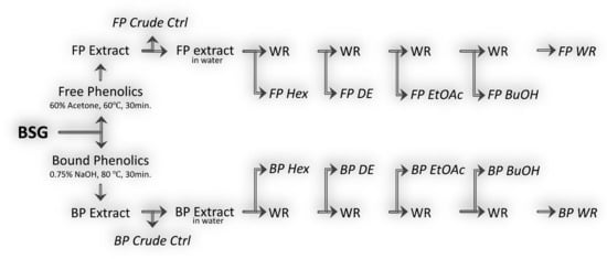 Extraction process of free and bound phenolic compounds from BSG followed by their partitioning using different organic solvents. FP—free phenolics, BP—bound phenolics, WR—water residue, Hex—hexane, DE—diethyl ether, EtOAc—ethyl acetate, BuOH—butanol, Ctrl—control.