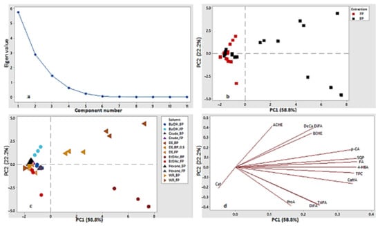(a) Scree plot of BSG FP and BP extracts and fractions; (b) Score plot for the first two components (PC) separated by the type of extractions FP and BP; (c) score plot for the first two components separated by the type of organic solvent used for fractionation of the FP and BP extracts; (d) loading plot of the first two components.