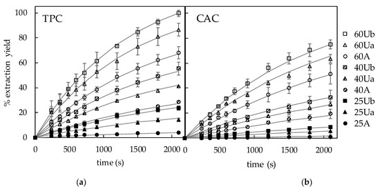 The TPC yield increased, after 35 min of extraction with agitation, from 4–68% when the temperature increased from 25–60 °C. In the case of the ultrasound-assisted extraction, the yield increased from 13–82% in Ua experiments (200 W/L) and from 24–99% in Ub experiments (335 W/L) for the same time and temperature interval. With regard to the CAC extraction yield after 35 min, it increased from 1% at 25 °C to 46% at 60 °C for the experiments with agitation, while the increases in Ua experiments were from 6–60%, and from 8–75% in Ub experiments, for the same temperature increase.