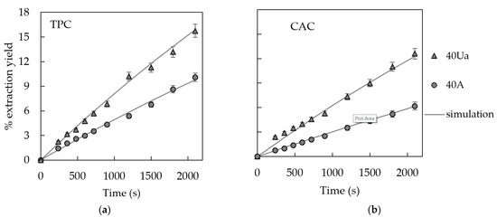 Experimental and simulated extraction yield curves of (a) total polyphenol content (TPC) and (b) chlorogenic acid content (CAC) from artichoke stem slabs (1 cm thickness) at 40 °C with agitation (A, 100 rpm) and acoustic assistance (Ua, 200 W/L).