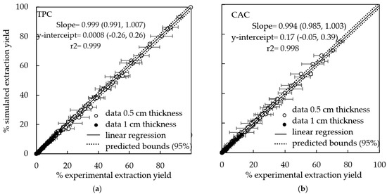 Figure 3 shows the simulated vs. experimental TPC and CAC extraction yields for all the experiments carried out with both slab thicknesses, the linear regression of these data (slope and y-intercept) and predicted bounds at 95% of confidence. The coefficients of determination were >0.99, the slopes were not significantly different to 1 (p > 0.05) and the y-intercepts were not significantly different to zero (p > 0.05), indicating a good agreement between both groups of data, experimental and simulated.