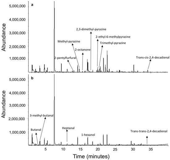 ) at day 0 obtained for roasted (a) and fried (b) sunflower seed samples.