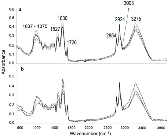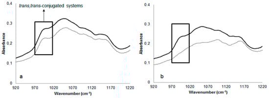- Guillen, M.D.; Goicoechea, E. Detection of Primary and Secondary Oxidation Products by Fourier Transform Infrared Spectroscopy (FTIR) and1H Nuclear Magnetic Resonance (NMR) in Sunflower Oil during Storage. J. Agric. Food Chem. 2007, 55, 10729–10736. [Google Scholar] [CrossRef]
