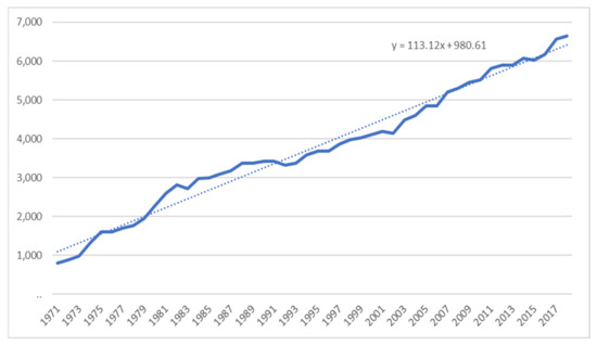 While there are fewer farms, these farms have much higher revenues than those of 50 years ago [47], as we can see from Figure 5, which shows the growth in farm cash receipts from dairying in Canada from 1971 to 2018, in millions of dollars. When supply management was created, dairy farmers had limited means to communicate and gather market intelligence to fully access market conditions. Today, most farmers are highly educated and can run their operations with start-of-the-art equipment [48].