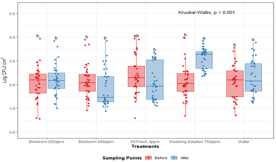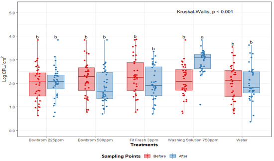 Mesophilic aerobic plate counts (Log CFU/cm2) before and after treatment application on pork loin sections (n = 36 per treatment). In each boxplot, the horizontal line crossing the box represents the median, the bottom and top of the box are the lower and upper quartiles, the vertical top line represents the upper interquartile range, and the vertical bottom line represents the lower interquartile range. Boxes with different letters a,b are significantly different according to Kruskal–Wallis analysis followed by pairwise comparison Wilcoxon’s test at p < 0.05. The points represent the actual data points. Active ingredients: Bovibrom = 1,3-Dibromo-5,5-dimenthylhydantoin; Fit Fresh = chlorine dioxide; Washing Solution = rhamnolipid.