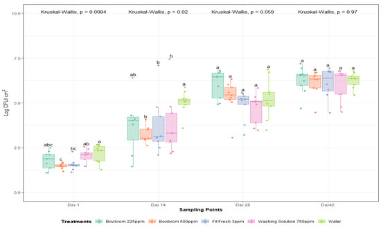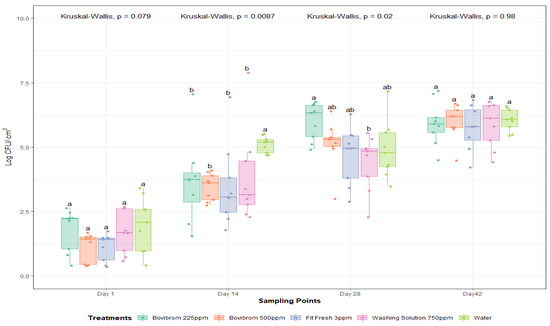 Mesophilic aerobic plate counts (Log CFU/cm2) after 1, 14, 28, and 42 days of dark storage time on pork loin sections (n = 45 per dark storage time). In each boxplot, the horizontal line crossing the box represents the median, the bottom and top of the box are the lower and upper quartiles, the vertical top line represents the upper interquartile range, and the vertical bottom line represents the lower interquartile range. For each sampling point day, boxes with different letters a,b are significantly different according to Kruskal–Wallis analysis followed by pairwise comparison Wilcoxon’s test at p < 0.05. The points represent the actual data points. Active ingredients: Bovibrom = 1,3-Dibromo-5,5-dimenthylhydantoin; Fit Fresh = chlorine dioxide; Washing Solution = rhamnolipid.
