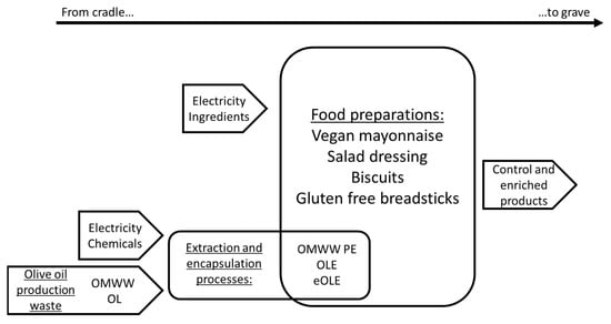 The aim of this study is to quantify the environmental impact of the extraction of bioactive phenolic compounds from olive oil mill wastewater and olive leaves. To evaluate the impact of phenols’ extraction and encapsulation processes within the entire supply chain, lab-scale food preparations were analyzed. Moreover, technological and nutritional parameters (oxidation induction time and total phenols content) were used to assess the environmental performance of production process based on benefits deriving from adding the phenolic extract in four food preparations: vegan mayonnaise, salad dressing, biscuits, and gluten-free breadsticks.