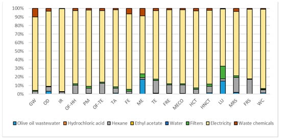 Factors influencing the OMWW PE extraction were reported in Figure 2. The factor electricity reached the highest values for all the impact categories from the lowest value reached in LU (67%) to the highest one reached in IR impact category (97%). This large contribution depends on the energy demand from the equipment necessary for the extraction of phenols from olive oil wastewater; the major contribution comes from the evaporator, which absorbs 86% of the overall energy consumption. Despite the tiny quantity used and allocated to this extraction process, the contribution of hexane covers an average weight among impact categories equal to 8% and thus represents the second contribution factor. The waste chemicals factor, which refers to the waste management of chemicals, represents the third contribution of this extraction technique, contributing with an average weight among impact categories of about 3%.