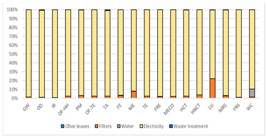 As for the OMWW PE, also for the OLE process (Figure 3), the electricity contributes mainly to all the impact categories with an average contribution of about 97%. This high level of contribution is directly linked to the energy consumption of the freeze dryer (97% of the total energy consumption). The second contribution factor is identified in the paper filters used, even if this factor has a contribution of about 4% among impact categories