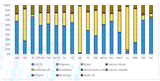 According to Flamminii et al. [], 0.4 g of OLE, 0.4 g of pectin, 1.64 g of calcium citrate, 0.4 g of alginate, and 17.16 mL of water were mixed to 98 g of sunflower oil and 2 g of Span 80 (emulsifier) and agitated using a stirring plate (0.4 kW, 15 min). Then, 20 g of sunflower oil and 0.5 g of glacial acetic acid were added and agitated using a stirring plate (0.4 kW, 30 min). Then, 3 g of OLE, 145.42 mL of water, 0.83 g of calcium chloride, and 0.75 g of Tween20 (surfactant) were added to the mixture and agitated again using a stirring plate (0.4 kW, 30 min). To obtain the beads (92% water content and 8% dried matter), a centrifuge was used for 5 min (0.800 kW). Then, 30 mL of ethanol solution (21 mL ethanol, 8.94 mL water, and 0.6 g OLE) was added to obtain 20 g of cleaned beads. Lastly, the beads were lyophilized using a freeze drier for 24 h (1.4 kW) to obtain 1.60 g of eOLE. Then, 300.5 g of exhausted oil were treated as waste oil. Input and output data related to this analysis and allocated to the FU (1 g of TPC equivalent to 5 g of eOLE) are reported in Table 5.