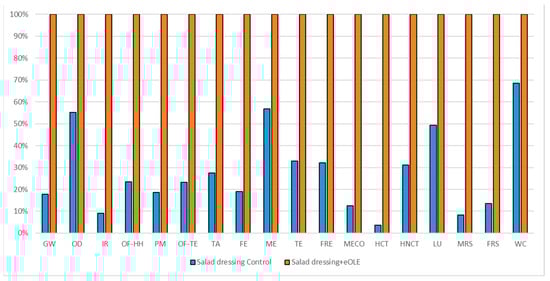 The salad dressing shows a simple formulation, which does not require particular ingredients or transformation, highlighting a large benefit in choosing the traditional salad dressing rather than the enriched one if considering the commercial unit (135 g) (Figure 7 and Table S2).