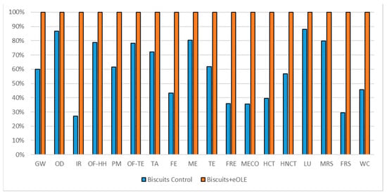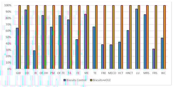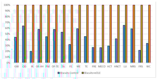 According to Paciulli et al. [], for the biscuits, 17 g of water, 1 g of salt, and 1 g baking powder were mixed with 100 g of soft wheat flour using a blender for 15 min (0.3 kW). Then, 30 g of butter and 50 g of icing sugar were blended for 3 min and then added to the dough and blended for another 6 min. The final dough (200 g), after a chilling phase of 10 min in a refrigerator, was formed manually to obtain 12 biscuits. After the cooking phase (180 °C; 20 min; 0.530 kW), 12 biscuits (13.5 g each) were obtained. For the enriched formulation (Biscuits + PE), 99.45 g of soft wheat flour and 0.55 g of eOLE were blended for 15 min (kW); the blended mixture was added to the solution of 17 g of water, 1 g of salt, and 1 g of baking powder. The other steps that follow are the same as for the traditional formulation. Input and output data related to this preparation are reported in Table 8.