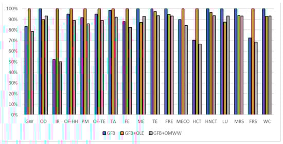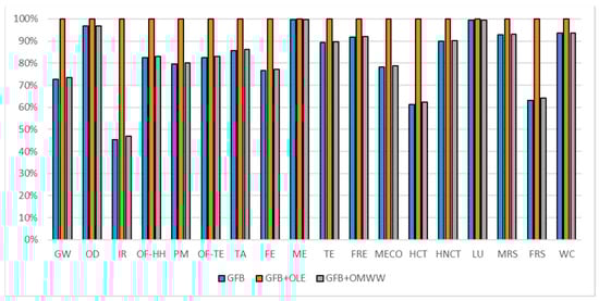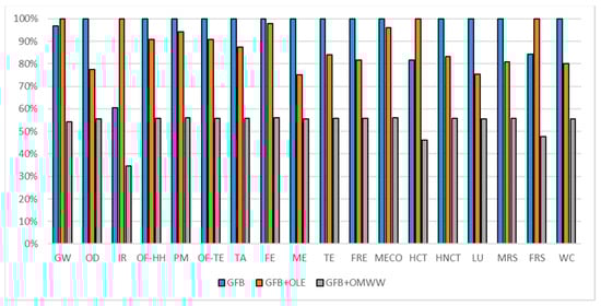 Considering the TPC normalization parameter and taking into consideration the average impact among the different impact categories, the differentiation made for the commercial unit cannot be carried out; in some impact categories, the highest level of impact is reached by the GFB control, and in others, the highest level is reached by GFB + OLE. A consideration that should be carried out is that the GFB + OLE on average represents the higher environmental impact formulation, representing the worst choice in most of the impact categories. The choice between the GFB control and GFB + OMWW PE should be linked to the impact category taken into consideration. An overview of the results obtained, considering all three parameters, identifies as the best choice the GFB + OMWW PE, even if in some cases, it means that it is not the best option among the three.