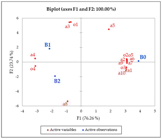 Principal component analysis was carried out on the correlation matrix of all samples and all attributes in order to graphically visualise the differences between the samples. The first two principal components accounted for all the variation in the data (Figure 1). The first axis (76.26%) mainly separated B0 from the two prototypes, whereas the second axis separated the two prototypes—B1 and B2 (23.74%). The majority of the attributes were positively correlated with the first axis and thus associated with B0. Important attributes included the complexity of the design, the amount of text, the brightness of the colour of the package, the noise of the package and the rigidity of the tray before and after opening the package. On the other hand, the two prototypes had a shinier inner tray and sharp edges. The B2 package had a rougher bottom surface, whereas B1 was easier to open.