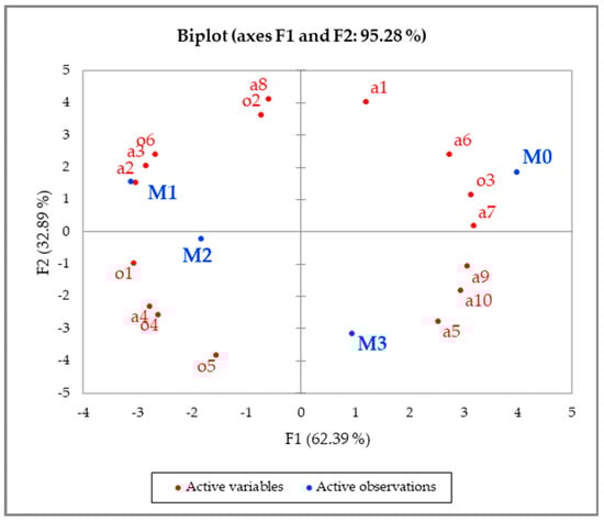 Principal component analysis of meat packages (M0, M1, M2, and M3) showing correlations with sensory attributes (codes on plot refer to sensory attributes codes in Table 3).