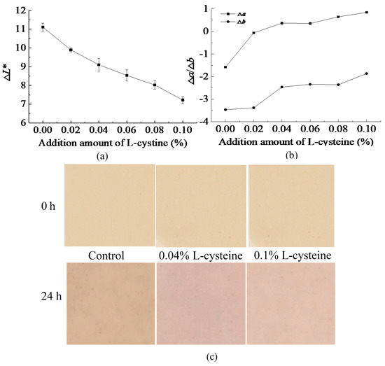 Effect of L-cysteine on the browning of FWN: (a) ΔL* of FWN, (b) Δa*/Δb* of FWN, and (c) pictures.
