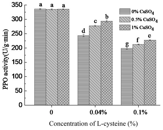Effect of copper acetate on PPO activity of PPO solutions mixed with L-cysteine. Different lowercase letters show significant differences (p < 0.05).