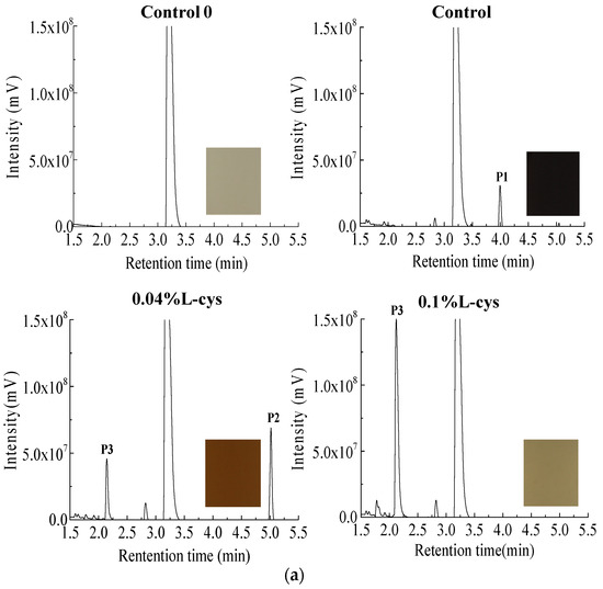 In order to explore the effect of L-cysteine on PPO browning products of FWN, the PPO-catechol system was used to simulate the PPO browning of FWN. The enzymatic browning products were analyzed by HPLC-TOF-MS (Figure 3). After 48 h reaction, the color of the PPO-catechol system in control group became darker, which suggested that colored substances were produced in the system. Compared with the control group, the color of the system with 0.04% and 0.1% L-cysteine was lighter, especially in 0.1% L-cysteine. It indicated that L-cysteine could significantly affect the generation of PPO browning products.