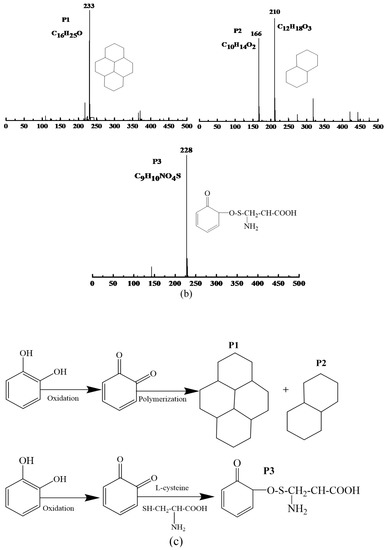 The molecular structure of P1, P2, and P3 was analyzed by mass spectrums and software MassLynx V4.1 (Waters Inc., Milford, MA, USA) (Figure 3b). The P1 was -C16H25O (m/z 233), and it might be a tetrameric compound, which was generated by the oxidative polymerization of catechol. The P2 possessed -C10H14O2 (166), a dimeric compound that produced by oxidative polymerization of catechol, or -C12H18O3 (210), which might be dimerized catechol residue. The P3 was identified as -C9H10NO4S (m/z 288) that might be six-carbon compounds derivatives, which was related to the reaction of L-cysteine and phthaloquinone. PPO catalyzed the dehydrogenation of catechol to 1,2-benzoquinone, which was extremely active. Once formed, it was immediately auto-oxidized and polymerized, causing brown substances [36,37].