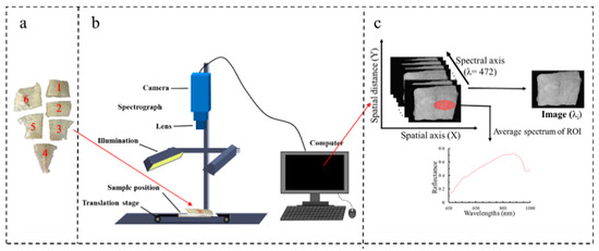 In this study, parameters of image acquisition are 32 cm of distance from the lens to the moving platform; 13 mm/sec of the horizontal movement speed of the moving platform; and 0.1 ms of the exposure time of the camera. Each hyperspectral image has 472 wavelengths with an increment of ~1.27 nm.