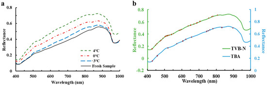 Region of interests (ROIs) within hyperspectral images were selected based on the locations where the reference subsamples had been collected for further assessment (as shown in Figure 1c). Finally, mean reflectance spectra from ROIs were presented as spectral data. Multiplicative scatter correction as the spectral pre-processing method was used to eliminate the undesirable scatter effect from the matrix prior to data modeling in this study [11]. We collected a total of 397 and 316 spectrums for TVB-N and TBA, respectively. This work was executed with ENVI 5.1 (ITT Visual Information Solutions, Boulder, CO, USA) software.