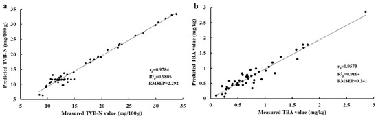 Scatter plots of predicted versus measured TVB-N (a) and TBA (b) obtained by FNN-simplified model based on the optimal wavelengths.