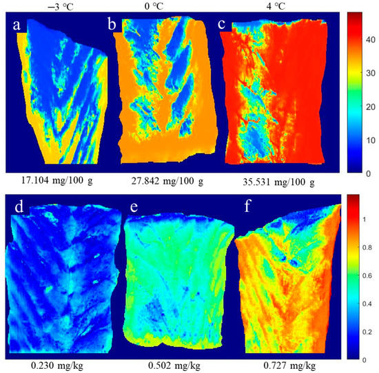 The great advantage of HSI technology is that the spectral and spatial information at each pixel in a hyperspectral image make it possible to reveal the freshness of fish by showing chemical images of the quality indicators obtained by using suitable calibration models [33]. To do so, the FNN-simplified method, obtained with the help of the selected reflectance spectra, was used to transfer information from each pixel in the hyperspectral image to the prediction of chemical values (TVB-N and TBA) in the fillet sample of large yellow croaker. This is because a simplified model is expected to be more representative of a practical scenario. It is expected that pixels with similar characteristics would present similar visualization with similar quality parameters [42]. Figure 4 shows the distribution map of TVB-N and TBA content in large yellow croaker fillets after 8-day storage at three low-temperature treatments (−3 °C, 0 °C, and 4 °C). Differences in TVB-N and TBA contents were observed using images in a fillet, which could imply the degradation of nitrogen-containing chemical compounds (i.e., protein) and the oxidation degree of lipids after 8-day storage at three low-temperature treatments. Figure 4a,b,d,e show that surrounding locations present higher values of TVB-N and TBA than the inner location, which means that the degradation and oxidation degree started at the edge of the fillet. This might be due to the ruptured cells, oxygen penetration, and microorganism activities at the cut surface [6,11]. Moreover, Figure 4c,f show a large area of red color, indicating that a higher level of degradation and oxidation degree has occurred during higher storage temperature (4 °C) than others (−3 °C and 0 °C). Thus, this further illustrates the alternation process of TVB-N and TBA contents in the fillet of large yellow croaker under the different storage treatments by comparing the different distribution maps of TVB-N and TBA contents, respectively. Additionally, it is a successful technique to evaluate the fillets’ freshness by showing the TVB-N and TBA contents via RGB images.