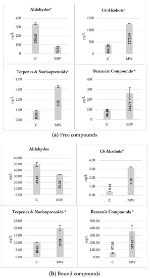 Terpenes and norisoprenoids are mainly in their bound form and may also be affected by intensive maceration techniques []. In fact, although they were found in small amounts, their concentration in both free and bound form increased in the musts treated with MW.