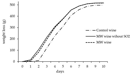 Figure 2 shows the monitoring of wines fermentation, representing the average weight loss value of triplicates. As can be seen, the lag phase was longer in the case of control wine, since the weight loss of the flasks started later, while microwave-treated wines began fermentation more quickly. Wines from MW maceration also showed faster fermentation kinetics and higher fermentation yield, which was slightly higher in the absence of SO2; this may be due to the lack of inhibition of yeasts due to SO2. This effect has also been observed in wines from Pinot Noir elaborated with MW maceration at high potency [,] and with other physical treatments used in grape maceration such as sonication []. Treatment with MW, as well as sonication, could achieve a greater extraction of compounds from the inside of the grape such as amino acids, fatty acids, and other nutrients that the yeasts could use for their growth, producing a greater quantity of metabolites and accelerating the fermentation process.