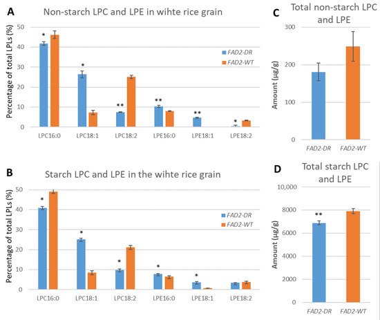 Fatty-acid composition of lysophospholipids in the white rice flour of FAD2-1 RNAi backcross lines. (A,B) Comparison of the fatty-acid composition of LPC and LPE in the non-starch and starch lipids between FAD2DR and FAD2WT; (C,D) Comparison of total LPC and LPE in the non-starch and starch lipids between FAD2DR and FAD2WT flours. * and ** indicate the significance of difference at p <0.05 and p <0.01, respectively.