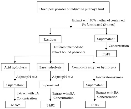 Extraction of free phenolics from the RP and WP was performed according to Li et al. [21] (Figure 1). Briefly, the dried pitahaya peel powder (0.5 g) were mixed with 15 mL of 80% methanol solution (including 1% formic acid). Ultrasonic cleaner (KQ-500DE, Kun shan, Jiangsu, China) was used to ultrasonic the mixture at 400 W power and 25 °C for 30 min. The supernatant was collected after centrifugation at 4000 r/min for 15 min. Residues were re-extracted twice as above. The supernatants were combined and concentrated with a rotary evaporator at 45 °C avoiding light, and the resulting extracts were dissolved in 70% methanol (final volume, 10 mL) for determination. This was the free phenolics of RP and WP (F1 and F2).