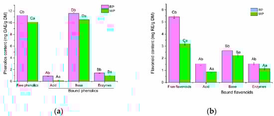 Phenolic compounds can be divided into free and bound forms, depending on whether they occur in the free form or are covalently bound to other molecules [27]. Free phenolic compounds are easily extracted by organic solvents, while a large amount of bound phenolics are difficult to extract [13]. In the present study, the contents and compositions of free phenolics by conventional methods (80% methanol extraction) and bound phenolics released by various hydrolysis methods (acid, base, and composite enzymes) in RP and WP were analyzed, respectively. As shown in Figure 2a, free phenolic contents of RP and WP was 11.3 mg GAE/g DW and 10.1 mg GAE/g DW, respectively. The content of free flavonoids in RP (5.4 mg RE/g DW) was significantly (p < 0.05) higher than that in WP (3.3 mg RE/g DW) (Figure 2b). The results indicated that the species of pitahaya fruit had influence on the contents of free phenolics. Free flavonoid contents in pitahaya fruit peel were slight lower than that reported by Kim, Choi, Moon, Kim, Mosaddik and Cho [17]. It may be due to the differences in species and cultivated regions of pitahaya fruit samples.