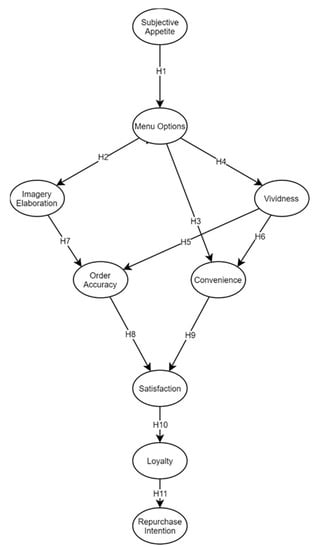 Figure 1 represents the theoretical research framework of the current study. The theoretical basis of the current model was derived mainly from Peters and Remaud’s [11] and other several studies. The model is developed from the factors of vividness, subjective appetite, and imagery elaboration, as investigated by Lee and Kim [12], and from the customer perceptions analysis of service performance, carried out by Cronin and Taylor [13]. The current model also incorporates factors such as value for money [14], convenience [15], taste preference [16], introducing latent variables such as menu options and order accuracy as well.