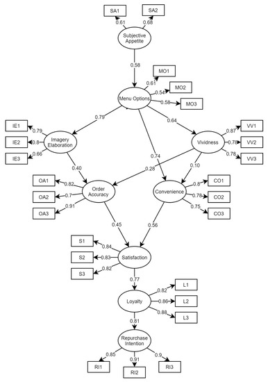 Over the past decades, drive-through fast-food industry has been one of the fastest growing businesses in the Philippines. According to the Philippines Statistics Authority, the fast-food industry has generated the highest income of PHP 203 billion with 4411 establishments in 2016. The purpose of this study was to evaluate factors influencing costumers repurchase intention in a drive-through fast food in the Philippines by utilizing the structural equation modeling approach [54,55,56,57,58,59]. A total of 305 Filipinos answered the online questionnaire, which contained 38 questions. The results of SEM indicated that subjective appetite (SA) was found to have significant direct effects on menu options (MO). Consequently, MO was found to have significant direct effects on imagery elaboration (IE), vividness (VV), and convenience (CO), and an indirect effect on order accuracy (OA). Finally, SA, MO, IE, VV, OA, and CO were found to have significant effects on satisfaction (S), which subsequently lead to loyalty (L) and repurchase intention (RI). Interestingly, MO was found to have the highest indirect effect on RI, indicating that MO is one important consideration for RI. The results of the present study can be applied and extended to evaluate the repurchase intention of drive-through fast food in other countries.