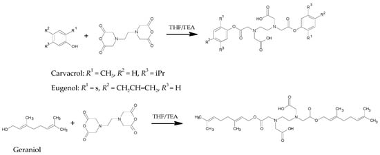 Pro-terpenes were synthesized via ring-opening transesterification of EDTA dianhydride with the hydroxyl group of terpenes (carvacrol, eugenol, thymol, and geraniol) in the presence of triethylamine (TEA) to yield diacids of terpenes with ester biodegradable bonds, as depicted in Figure 1. The pro-terpenes have high melting points compared to terpenes (three of the terpenes are liquid at room temperature) and are practically insoluble in water (Table 1). The high melting point, poor water solubility, and biodegradable linkers make these pro-terpenes suitable candidates for the development of stable YP pro-terpene formulations with controlled terpene release.