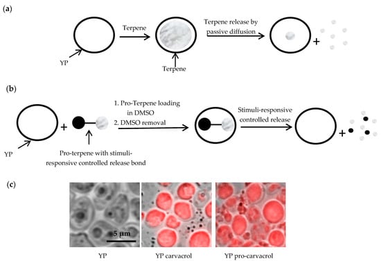 Schematics of (a) diffusion-controlled terpene loading in YPs and terpene release, (b) pro-terpene loading in YPs and stimuli-controlled terpene release and (c) microscopy images of Nile red stained YP control and YPs loaded with carvacrol and pro-carvacrol.