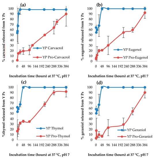 Kinetics of terpene release from YP terpene and YP pro-terpene containing (a) carvacrol, (b) eugenol, (c) thymol, and (d) geraniol. Samples were incubated in 0.1 M phosphate buffer saline (PBS, pH 7) at 37 °C at a concentration of 1 mg terpene/mL.