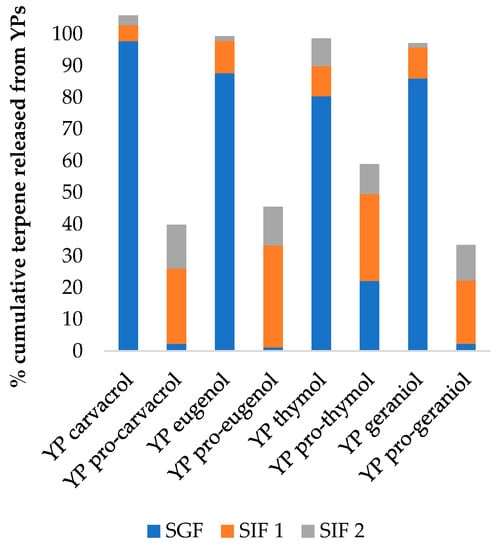 Cumulative terpene released from YPs after 1 h incubation in simulated gastric fluid (SGF) containing pepsin and after two 1 h incubations in fresh simulated intestinal fluid (SIF) with pancreatin.