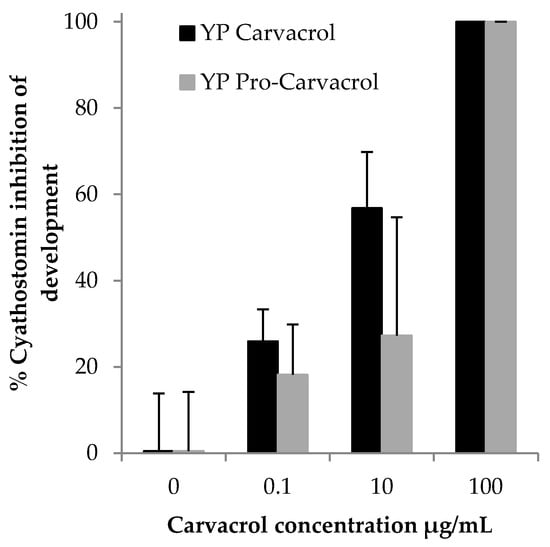 YP pro-carvacrol and YP carvacrol were evaluated in the cyathostomin E2L assay with samples showing similar dose-response activity (Figure 5) completely inhibiting E2L development at a concentration of 100 µg carvacrol/mL. A control of YP+EDTA also had some toxicity (~40–45% inhibition of larvae development, data not shown) at the highest EDTA concentration equivalent to the expected amount of EDTA generated from the hydrolysis of YP pro-carvacrol at 100 µg/mL. The long incubation period (seven days) required for the Cyathostomin E2L assay likely increased the impact of EDTA complexation of metal ions critical in processes of larvae development.